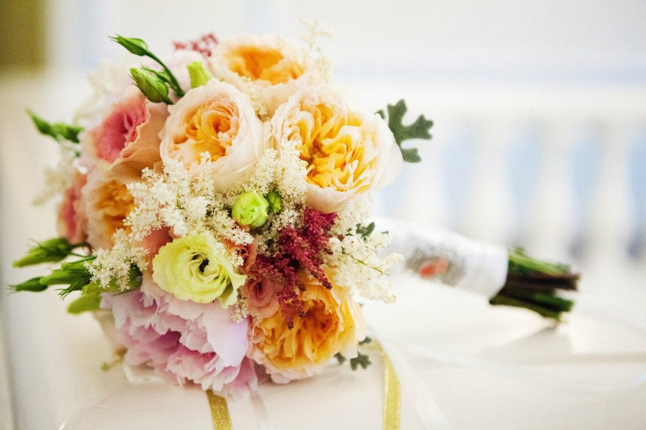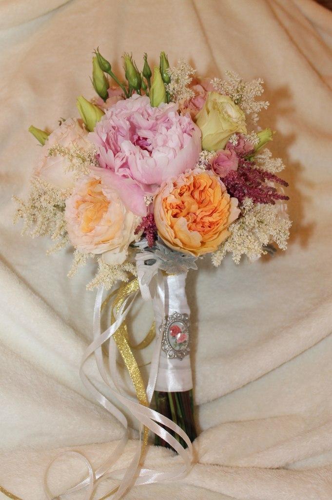 Букет невесты из остинских роз, пионов, астильбы, лизиантуса и цинерарии