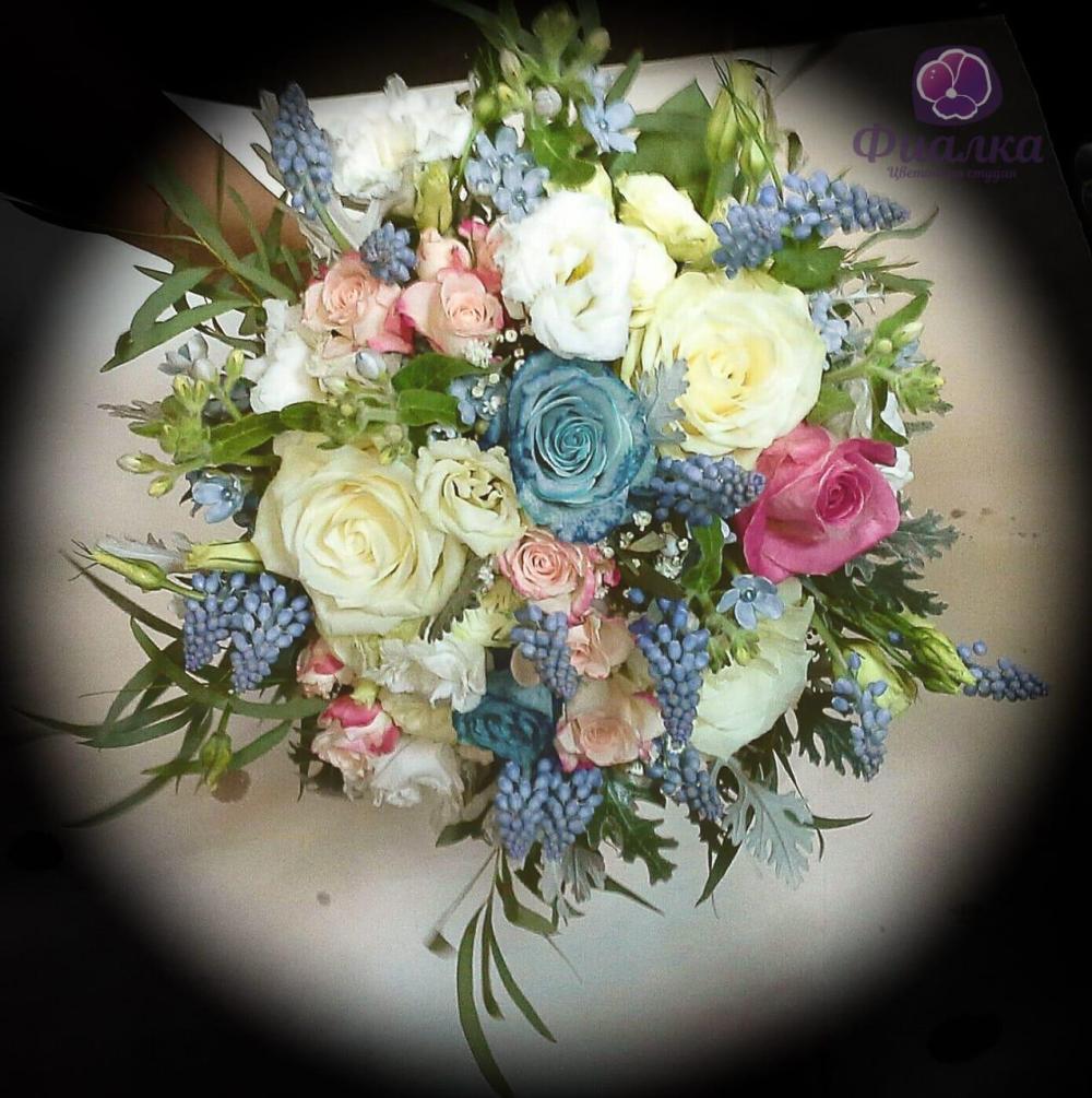 Букет из роз, мускари, твидии, кустовой розы и эвкалипта