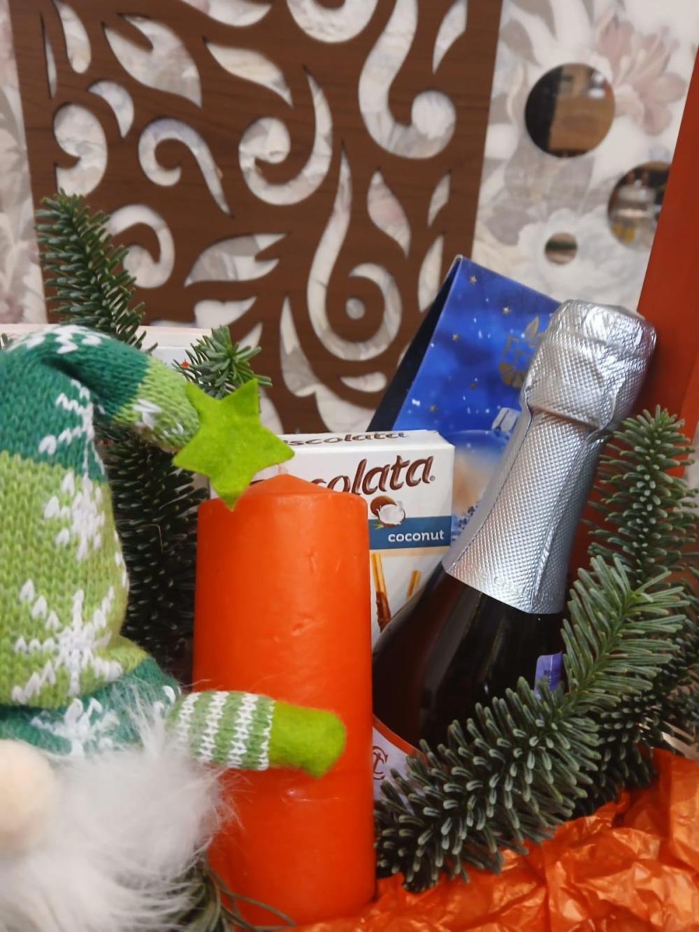 Красивый набор для близких в деревянном ящике, которые ценят изысканность и атмосферу. Мягкий свет свечей, волшебный светящийся гномик, гурманские угощения и аромат хвойных веточек создают идеальный новогодний вечер. Включает премиум сладости, чай, шампанское и всё необходимое для запоминающегося праздника.