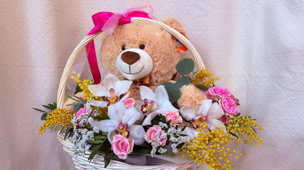 Состав данной композиции: орхидея цимбидиум, роза кустовая, лимониум, мимоза, эвкалипт, мягкая игрушка. Состав может меняться ,согласно Вашим пожеланиям ,и предпочтениям. И будет собран индивидуально для Вас.