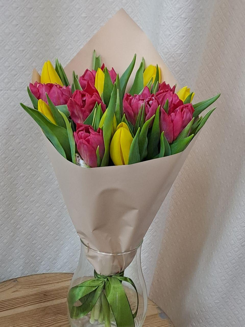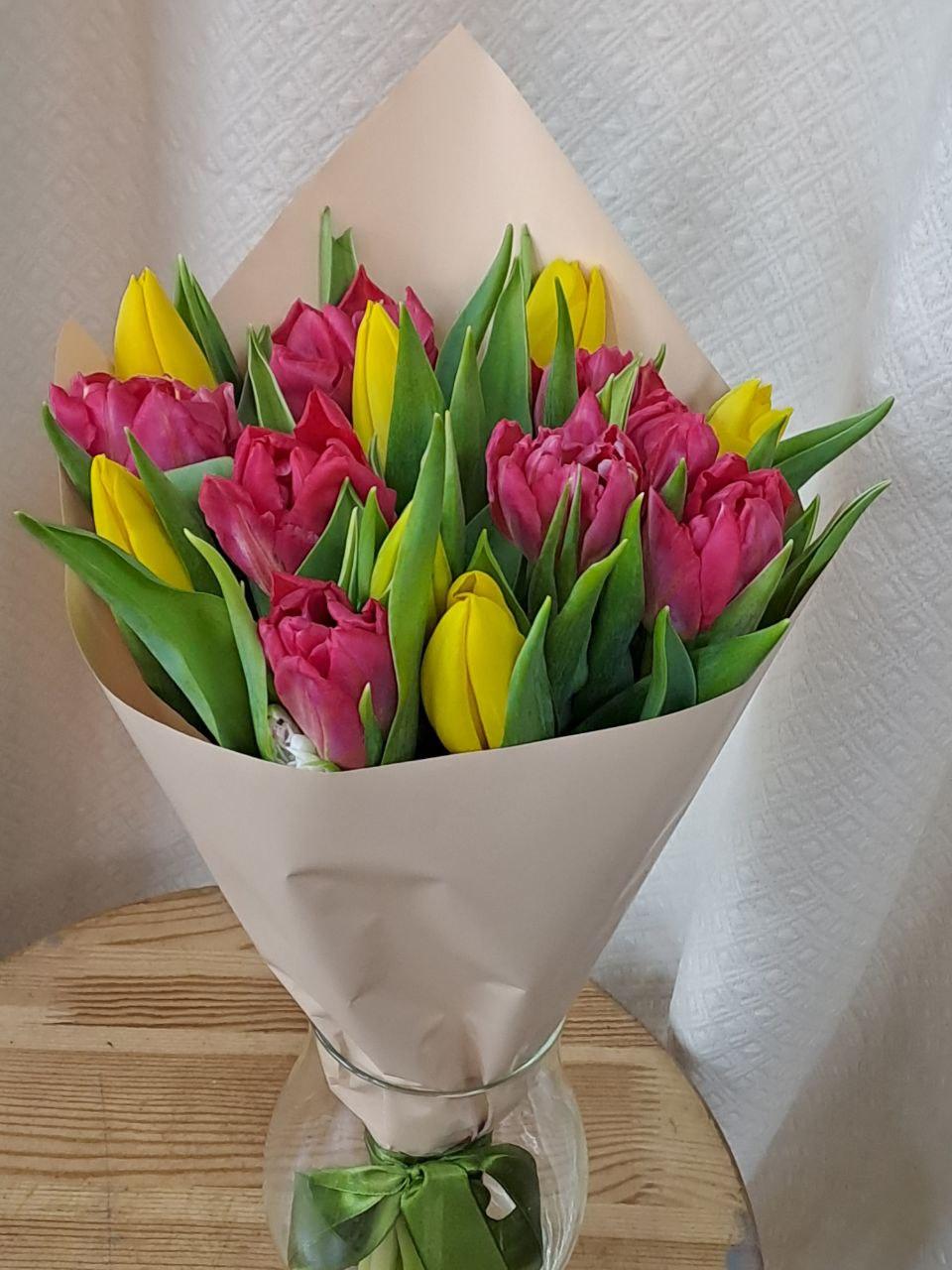 Подарите радость и весеннее настроение с нашим букетом "Солнечная Весна"! Этот яркий и стильный букет, сочетающий в себе жизнерадостные желтые и нежные розовые тюльпаны, станет прекрасным знаком внимания для ваших близких.